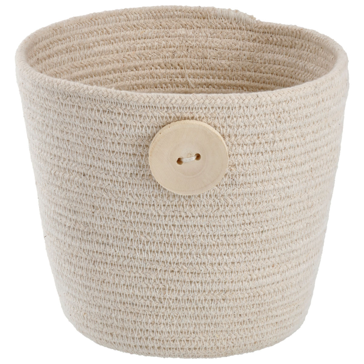 Dekorativ kurv i bomuld med påsyet træknap. Til mange slags brug, f.eks. som urtepotteskjuler til planter, som br⌀dkurv eller i brug på badeværelset.