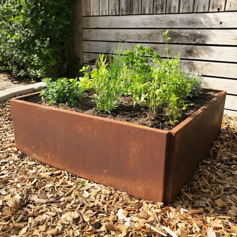 Aflange højbede i jern Flot højbed udført i jern, som efter kort tid får det helt unikke og rustne udseende. Et højbed som dette kan bruges overalt i haven, i køkkenhaven, på terrassen, i forhaven og i indkørselen – Det er faktisk kun fantasien som sætter
