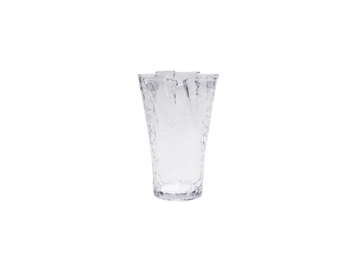 Ruffle Vase Clear bliver et smukt indslag i hjemmets interiør. Vasen har et visuelt tiltalende design og en række dekorative kvaliteter, der gør den til den oplagte tilføjelse til en lang række rum og indretninger. Vasen er fremstillet i mundblæst glas med en klar og tekstureret overflade, der skaber hyggelige reflekser og et smukt lysspil, når solen rammer den. Af denne grund kan vasen med fordel stilles i vindueskarmen eller andre solrige steder, hvor den dekorative effekt kan komme til udtryk. Et andet definerende træk ved vasens optik er den flotte udformning, der åbner sig ud imod toppen og er formet i smukke folder, der tilføjer et blødt og kunstfærdigt udtryk til det overordnede design. Dette gør Ruffle Vase oplagt som blomstervase eller til udstilling af andre smukke dekorationselementer. NB: Dette er et håndlavet produkt. Små variationer kan derfor forekomme i vasens form. Se flere vasedesigns fra Hübsch her.