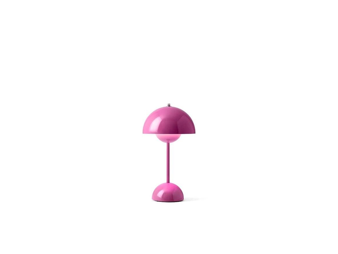Flowerpot VP9 Portable Bordlampe Magnetic Charger Tangy Pink er en bærbar version af Verner Pantons populære Flowerpot bordlampe. Med en højde på 29,5 cm. og en diameter på 16 cm. er lampen lidt mindre end den originale, der til sammenligning måler 50 centimeter i højden. Udover størrelsen er lampen tro mod Pantons originale design; med de to kuppelformede skærme de både reflekterer og skærmer for lyset. Lampen oplades let via det medfølgende USB-opladerkabel, hvorefter lampen kan bringes med rundt i hele hjemmet. Flowerpot VP9 har indbygget LED, med 3-trins dæmperfunktion, så du kan indstille lysstyrken til enten 100%, 50% eller 20% styrke. Lyset justeres let via kuglen på toppen af skærmen, der har fået touch-funktion på den nye lampe. På en fuld opladning kan lampen anvendes i 10 timer på 100% lysstyrke. Anvender du lampen til hyggebelysning på 50% eller 20% kan lampen holde endnu længere. Med en tæthedsgrad på IP44 kan lampen også anvendes i haven, på terrassen eller altanen, hvor den giver en hyggelig belysning til de sene sommeraftner. Vælg mellem alle de glade farver her