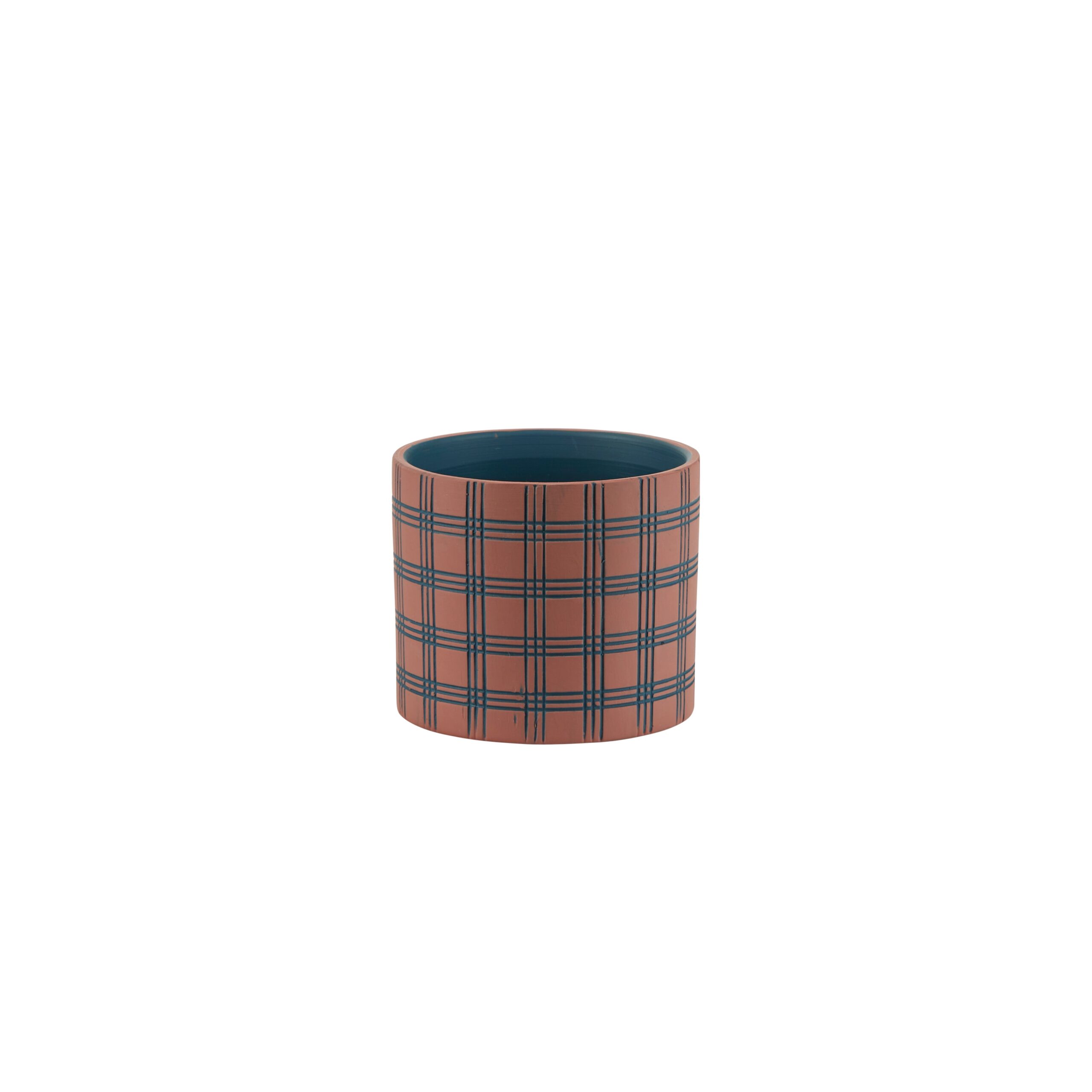 Enkel urtepotteskjuler fra Bahne Interior. Urtepotteskjuleren er designet med plaid tern i farverne blå og rosa. Kun egnet til indendørs brug.
